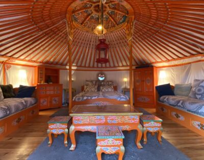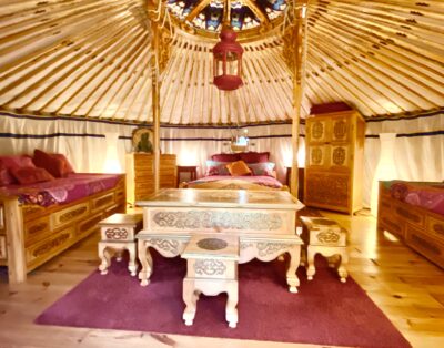 La yourte comprend les éléments suivants : une porte, 5 murs, deux poteaux ,des perches ,une couronne centrale, des Cordes en crin de cheval tressé à la main , une toile de coton, une épaisseur de feutre de 10 mm en laine de mouton, une toile imperméable décorée, un carre de toit, et une bande décorée recouvrant le bas de la yourte. Elle est toute équipées de meubles traditionnels mongols, l’été une table de jardin avec un barbecues sont à votre disposition. Les petits déjeuners vous sont apportés à votre yourte si vous le désiré. Pour le moment, il est impossible de cuisiner dans les yourtes, par contre nous pouvons livrer des repas sous la yourte ou vous pouvez venir déguster nos spécialité chez nous.
